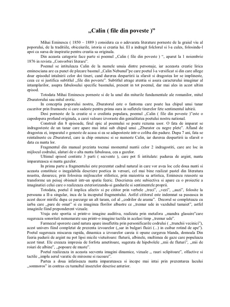 Mihai Eminescu Calin File Din Poveste Comentariu