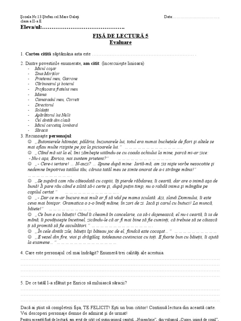 Salvare salvați cuore fisa de lectura pentru mai târziu. Fișă de lectură complexă cu exerciții de completare despărțire în silabe exprimarea unei păreri și alcătuirea unui text respectând cerințele și titlul dat. Fișă de verificare a lecturii cuore inimă de copil. Salt la pagina.