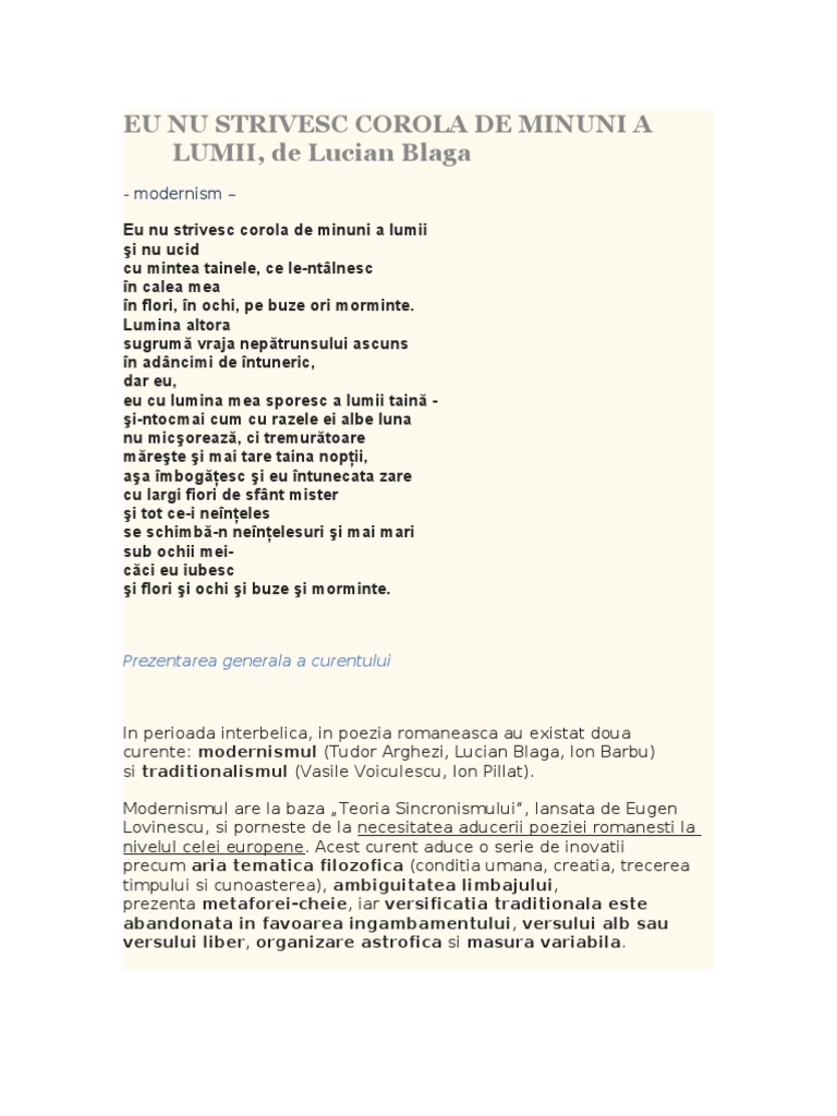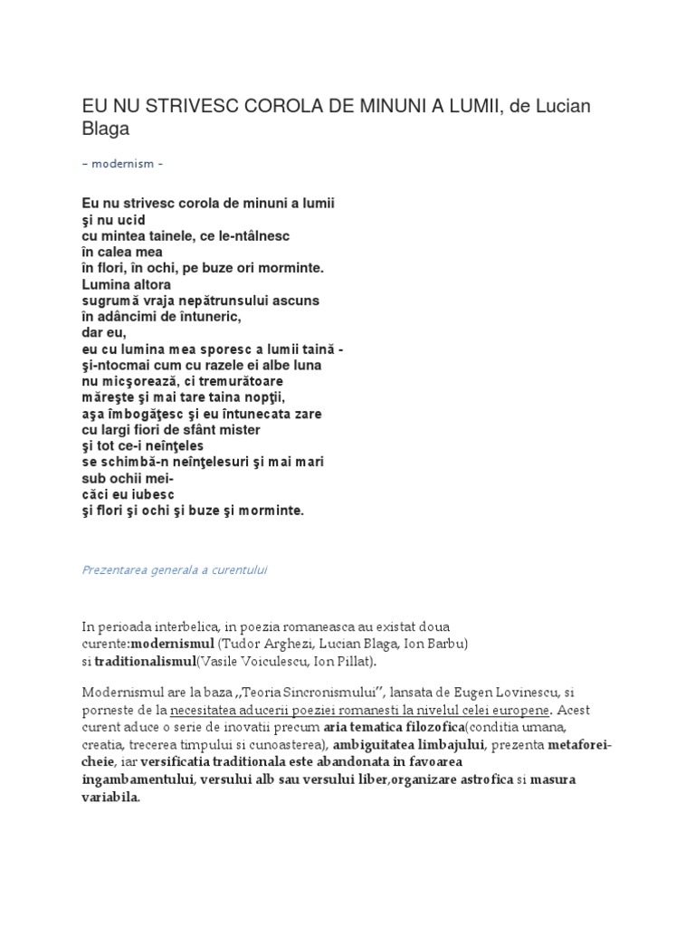 Doc Eu Nu Strivesc Corola De Minuni A Lumii De Lucian Blaga Ars Poetica Poezie Modernistă Bitfoi Ioana Cristina Academia Edu