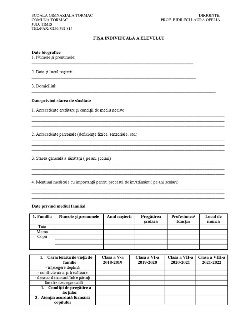 Fisa Individuala A Elevului