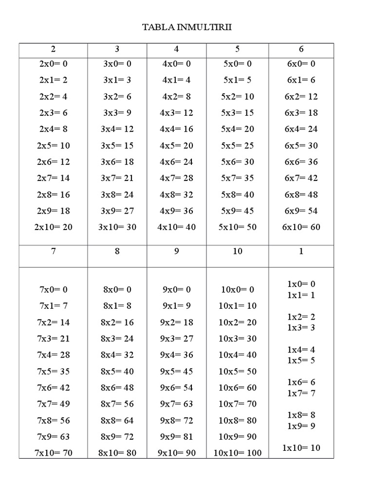 Tabla Inmulțirii Planșe Pentru Inmulțirea Numerelor Naturale