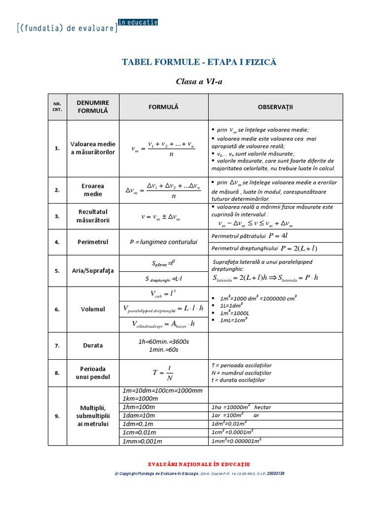 Tabel Formule Clasa A 6 A Matematica Si Fizica