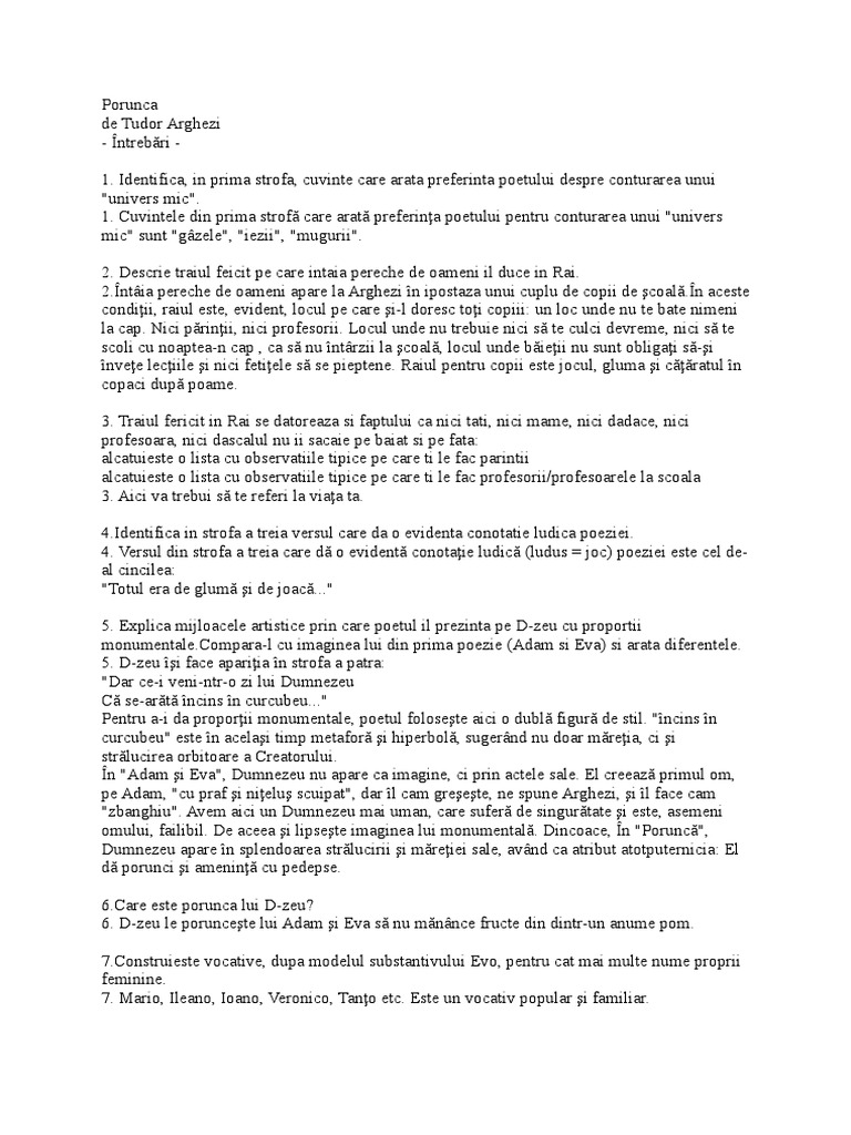 Recapitulare monorima alcatuita din succesiunea acelorasi sunete finale într o întreaga poezie sau în mai multe versuri dintr o poezie. Testament de tudor arghezi este o arta poetica moderna un text programatic si inovator pentru perioada in care vede lumina tiparului. Este întâlnita frecvent si în poezia populara si în poezia culta. Explica mijloacele artistice prin care poetul il prezinta pe d zeu cu proportii monumentale compara l cu imaginea lui din prima poezie adam si eva si arata diferentele.
