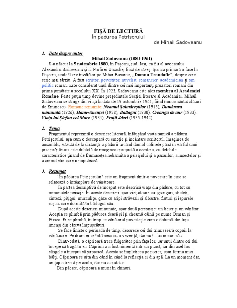 Fișă De Lectură In Pădurea Petrișorului De Mihail Sadoveanu Doc Document