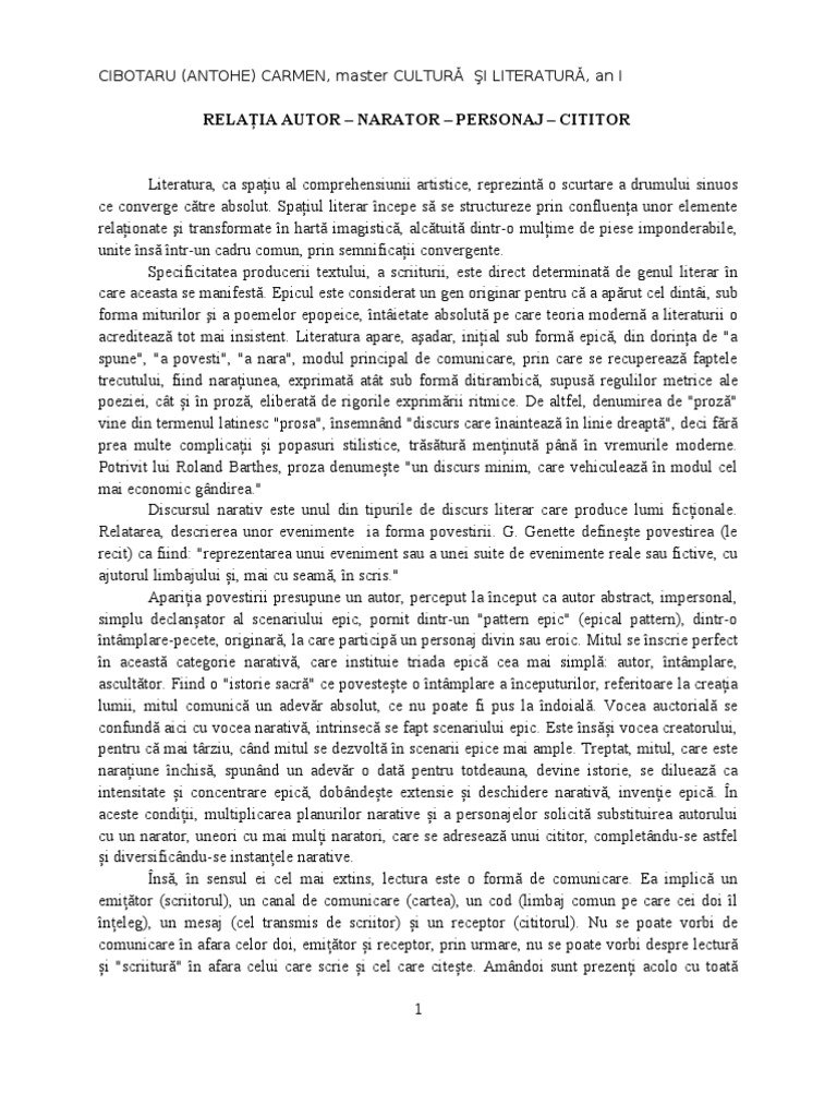 Relaţia Autor Narator Personaj Cititor Cibotaru Carmen