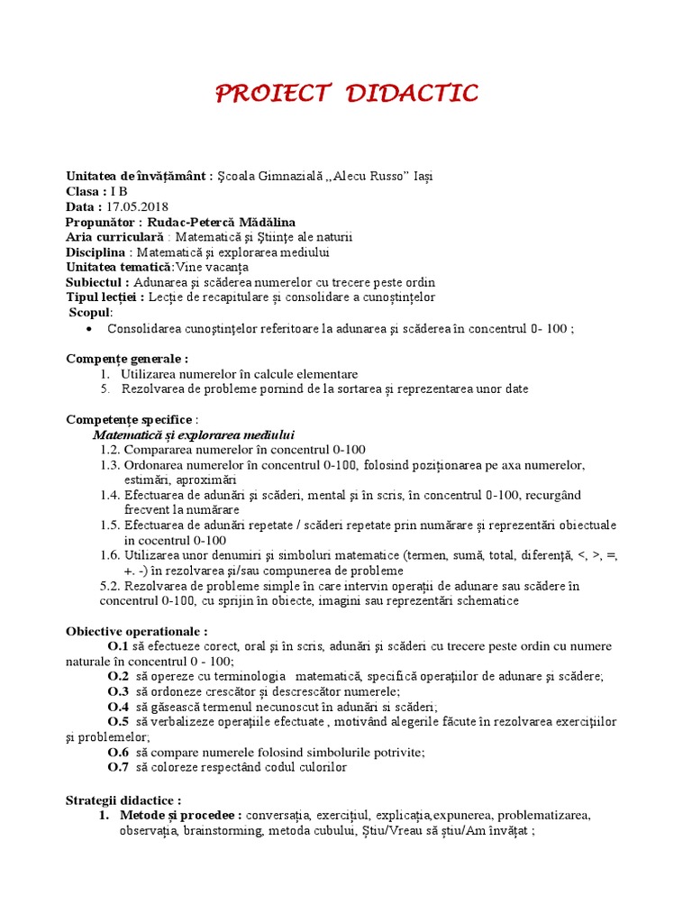 Doc Adunarea Si Scaderea Proiect De Lectie Alexandra Tomulescu Academia Edu