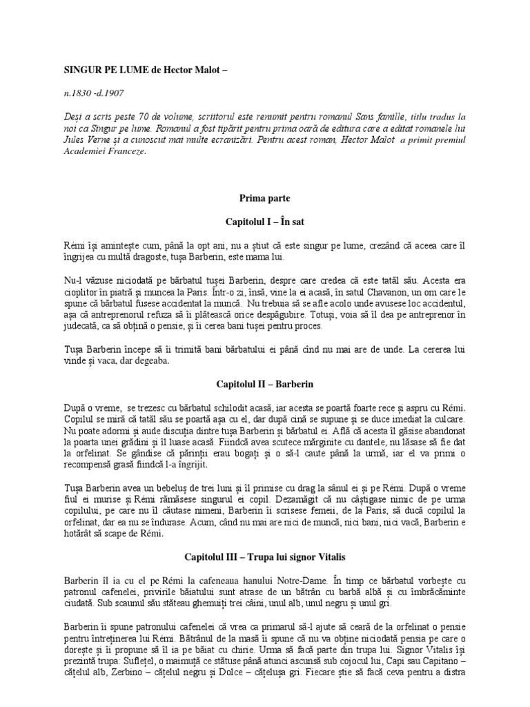 Rezumat Singur Pe Lume Pdf Pdf Document