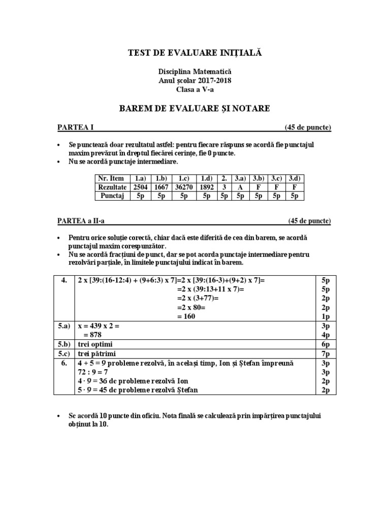 Rezolvare Barem De Corectare Test Initial Matematica Clasa A 5 A